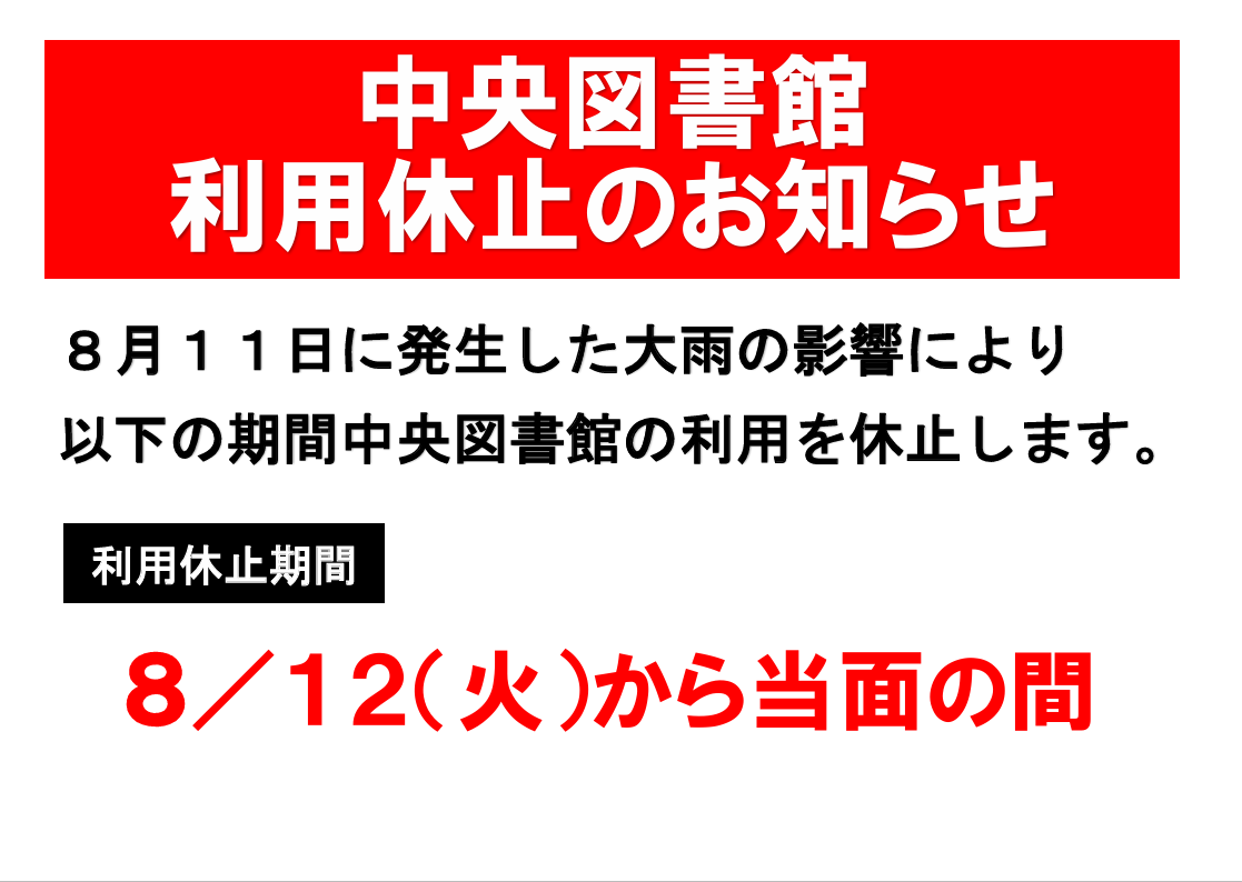 令和7年8月11日(月)に発生した大雨の影響により、施設の安全確保及び復旧作業のため、当面の間、施設利用を休止します。ご利用予定の皆さまには大変ご迷惑をおかけしますが、ご理解とご協力をお願いいたします。なお、本の返却につきましては、大矢野・姫戸・龍ヶ岳図書館にお願いします。また、電話もつながりませんので、お問い合わせ及び郵便物の送付については、上天草市本と歴史の交流館イコットまでご連絡ください。