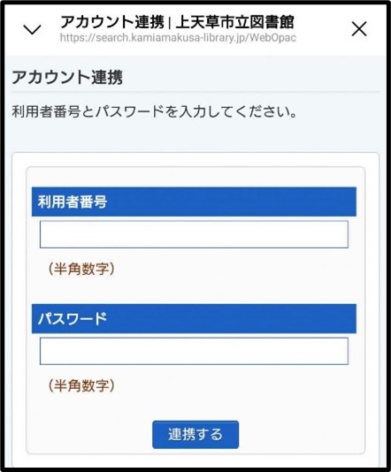 メニューのアカウント連携をタップして、利用者番号とパスワードを入力してください。